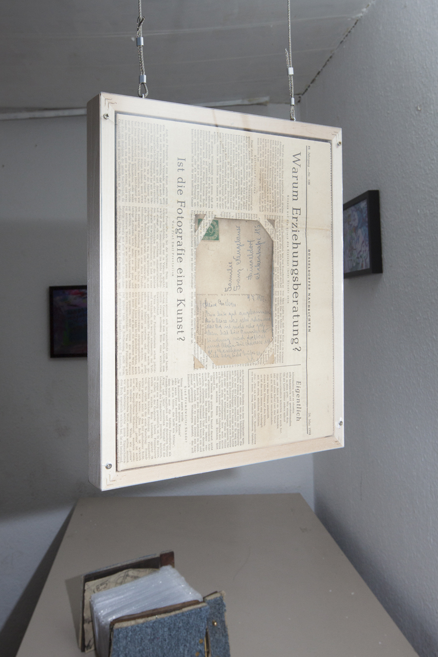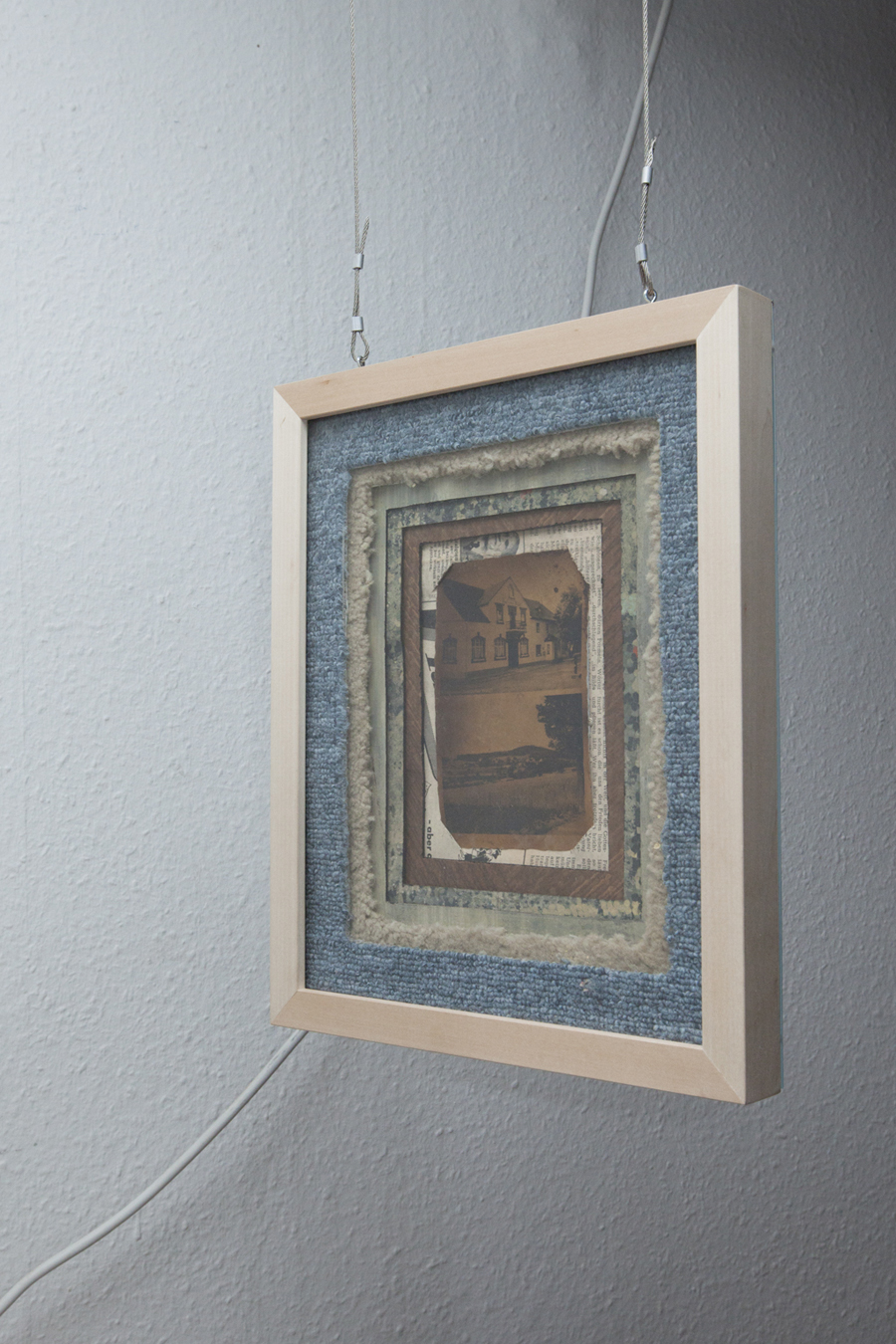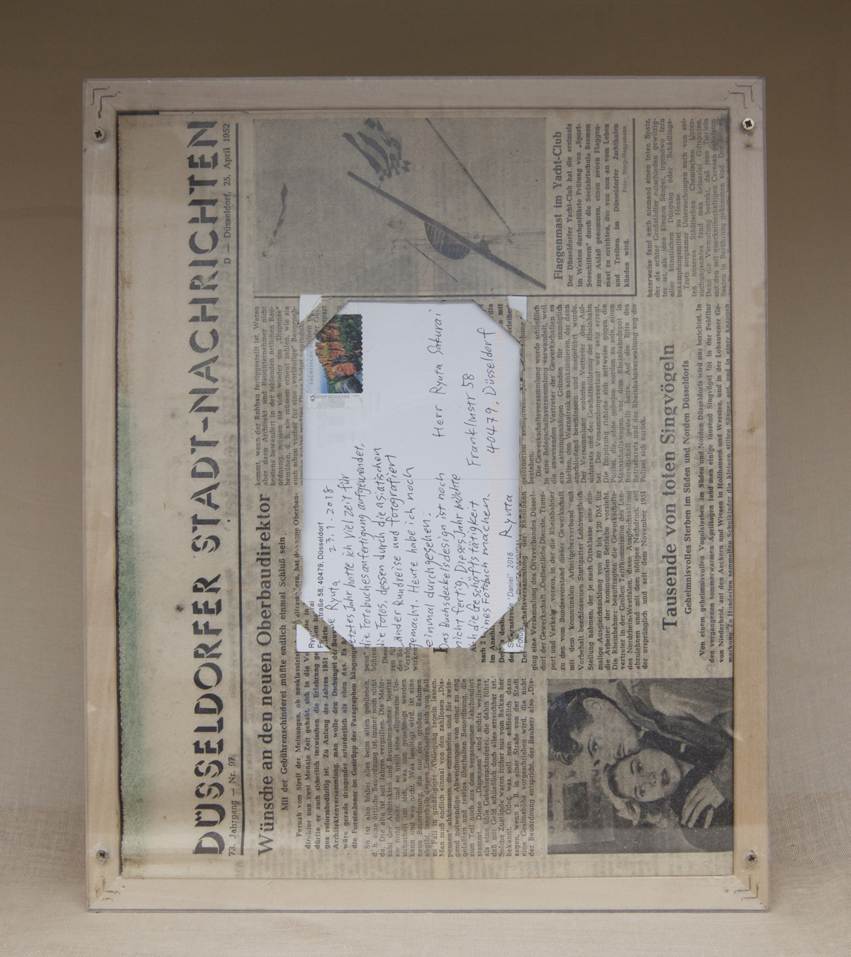 櫻井がデュッセルドルフの自宅に入居してきた2015年当時、既にその部屋には青色の古い絨毯が敷かれていた。ある日、櫻井は、その古い絨毯を取り去ってしまおうと捲り上げた時、その下にまた更にベージュ色の絨毯が敷かれていて、その下に続いてまた更に古いマットが重なり、最終的に計5枚の絨毯が層状になっていた。それは恐らくそれまでの入居者が、移り住む度に元々敷かれていた絨毯を、面倒であるが故に取り省かずに、その上に新しい絨毯を重ねて暮らしてきた結果である。その5層を成した最も底部に敷かれた敷物と床部の間には、1952年発行の地元新聞と、当時この部屋に住んでいたであろう家族宛に書かれた古く変色したポストカードを1枚みつけた。新聞紙の発行年数から約70年近く重なって敷かれていた事が推測される。櫻井は、発掘したそれらの素材を用いて作品を作り始めた。その5層の絨毯の中心を切り抜き、年代順に重ね層状を成しながら、最下部には古新聞に固定されたポストカードが中心に見えるような構造で、櫻井の部屋で起きた歴史的な実体験を、ブックマットに収められたストレート写真の額装作品に見立てて制作した。
