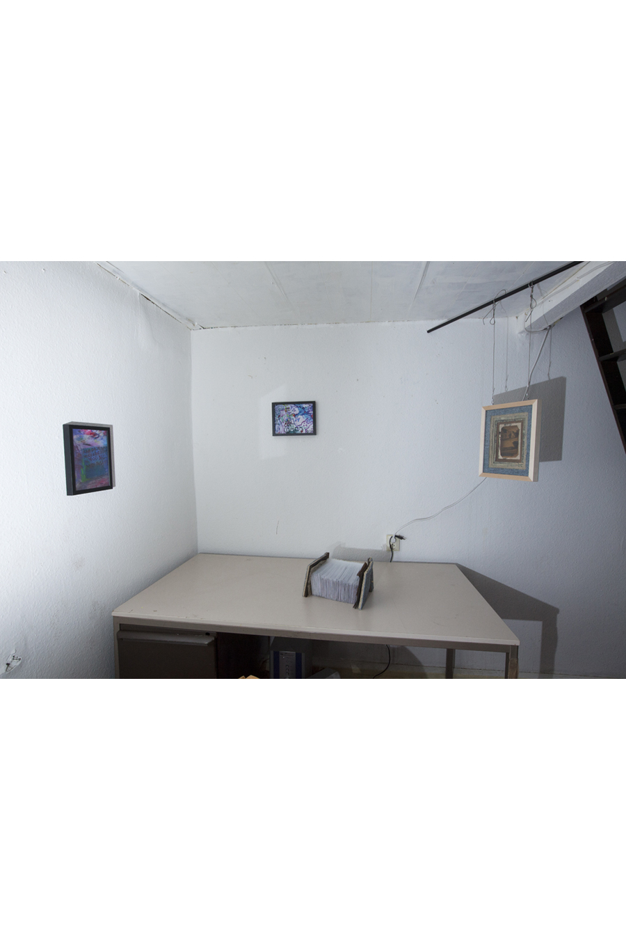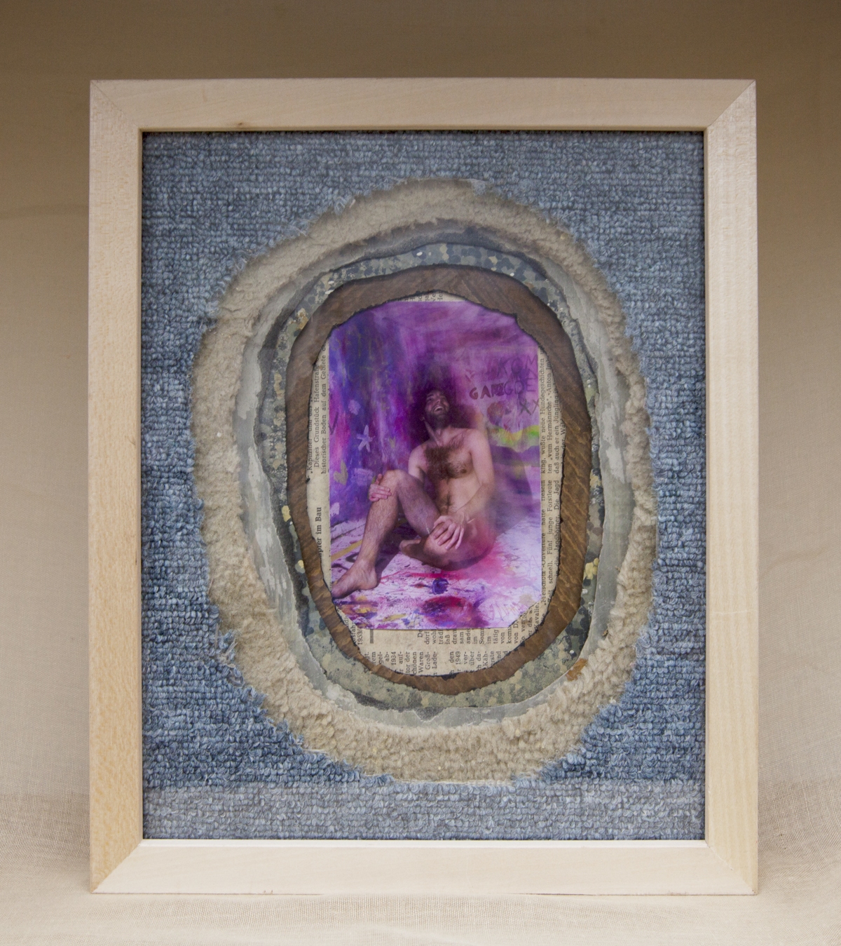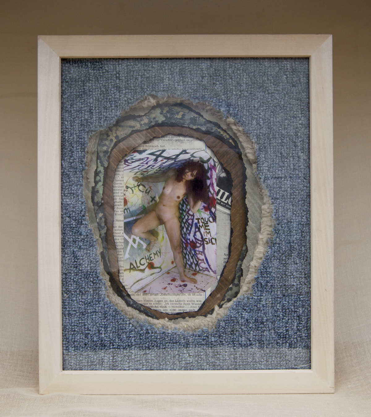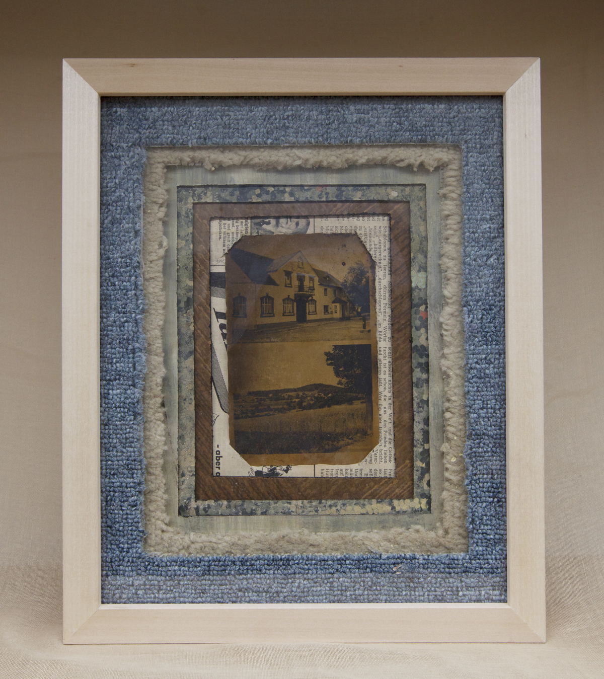 櫻井がデュッセルドルフの自宅に入居してきた2015年当時、既にその部屋には青色の古い絨毯が敷かれていた。ある日、櫻井は、その古い絨毯を取り去ってしまおうと捲り上げた時、その下にまた更にベージュ色の絨毯が敷かれていて、その下に続いてまた更に古いマットが重なり、最終的に計5枚の絨毯が層状になっていた。それは恐らくそれまでの入居者が、移り住む度に元々敷かれていた絨毯を、面倒であるが故に取り省かずに、その上に新しい絨毯を重ねて暮らしてきた結果である。その5層を成した最も底部に敷かれた敷物と床部の間には、1952年発行の地元新聞と、当時この部屋に住んでいたであろう家族宛に書かれた古く変色したポストカードを1枚みつけた。新聞紙の発行年数から約70年近く重なって敷かれていた事が推測される。櫻井は、発掘したそれらの素材を用いて作品を作り始めた。その5層の絨毯の中心を切り抜き、年代順に重ね層状を成しながら、最下部には古新聞に固定されたポストカードが中心に見えるような構造で、櫻井の部屋で起きた歴史的な実体験を、ブックマットに収められたストレート写真の額装作品に見立てて制作した。
