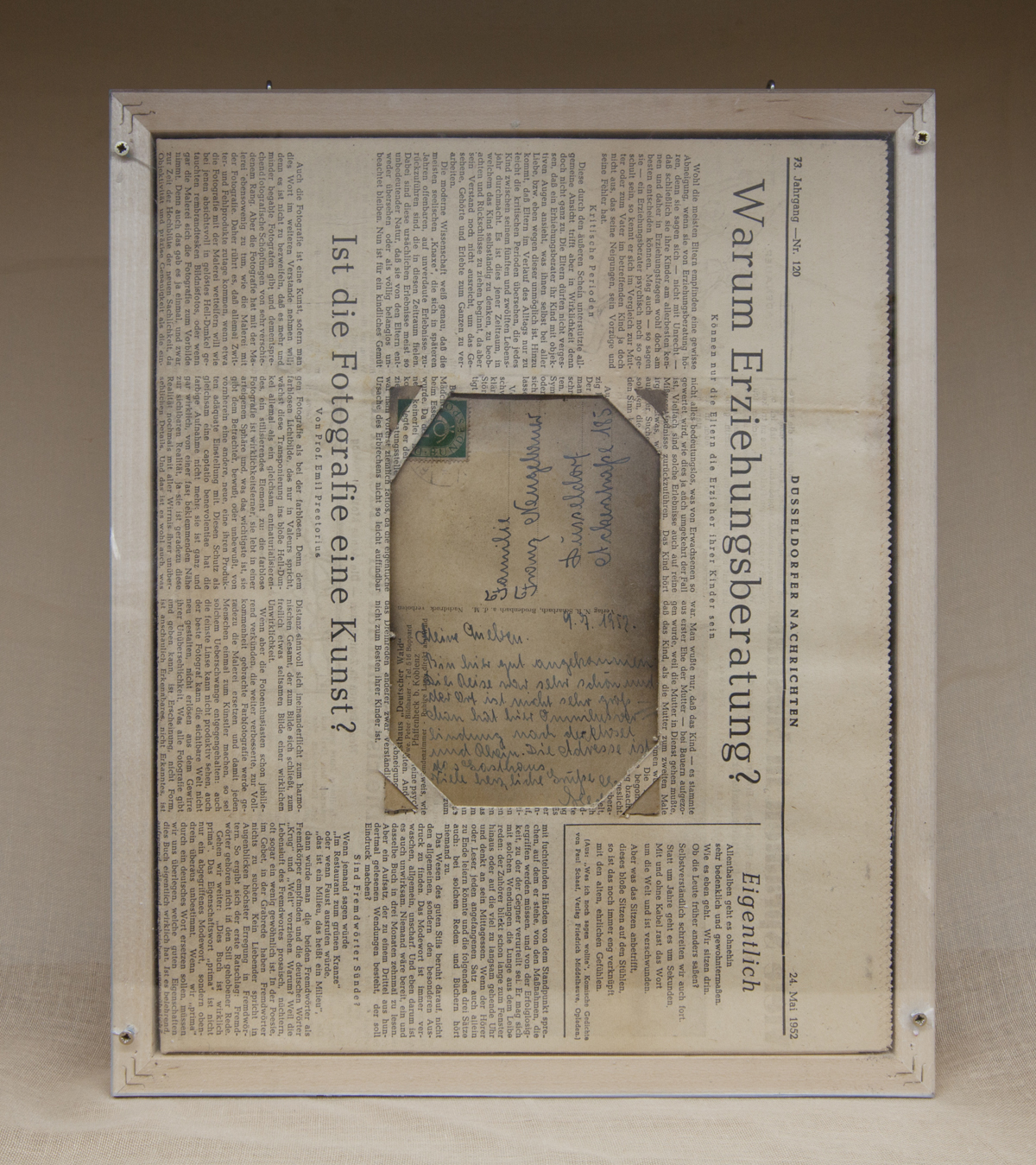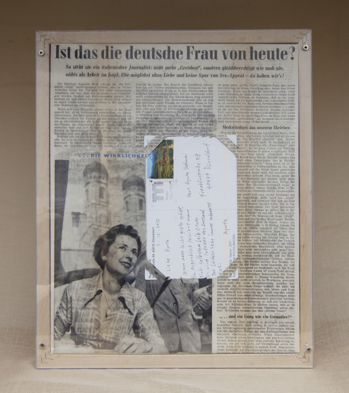 When Sakurai first moved into his home in Dusseldorf in 2015, the room was already covered with an old blue carpet. One day, when Sakurai rolled up the old carpet to remove it, he found another beige carpet underneath it, followed by another old mat, and finally five carpets in layers. This is probably the result of the fact that the previous tenants, every time they moved into the house, did not remove the original carpets because they were too cumbersome, but put new carpets on top of them. Between the bottom of the five layers of rugs and the floor, we found a local newspaper from 1952 and an old, discoloured postcard addressed to the family who must have lived in the room at that time. Based on the age of the newspapers, it is estimated that they had been laid on top of each other for nearly 70 years. Sakurai began to work with the materials he had unearthed. He cut out the centre of the five layers of carpet and layered them in chronological order, with a postcard fixed to the old newspaper visible at the bottom.